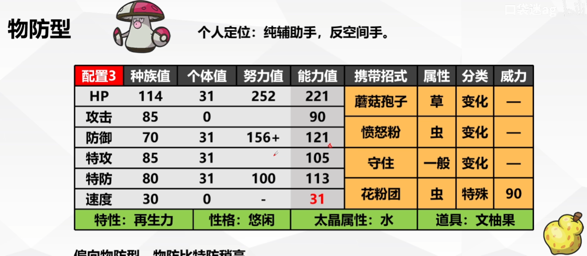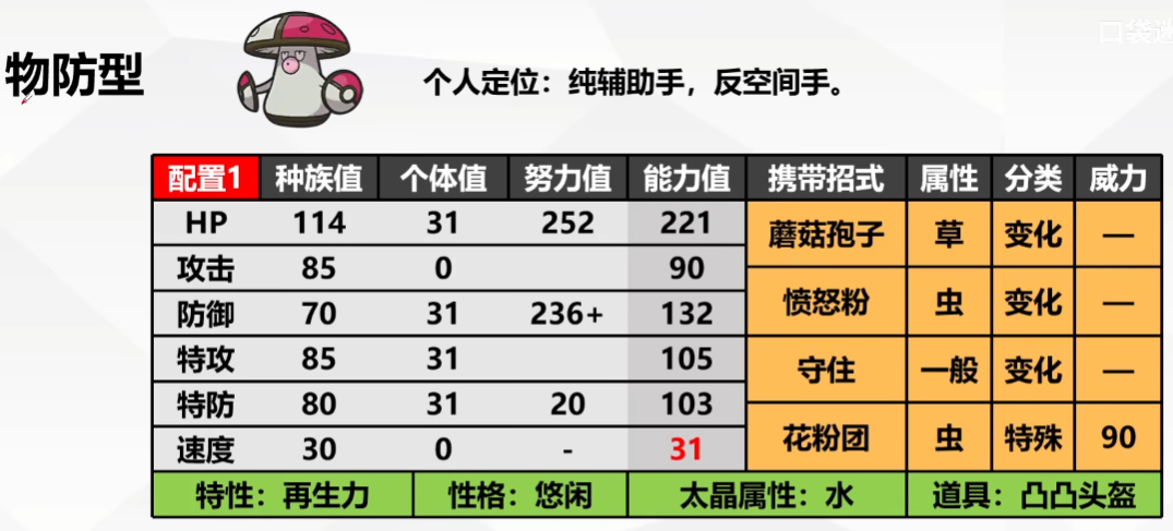 - 0攻0速,极限物防,携带凸凸头盔抵抗物攻型选手。其实也可以不0速,不参加比赛就打个排位的话无所谓。
