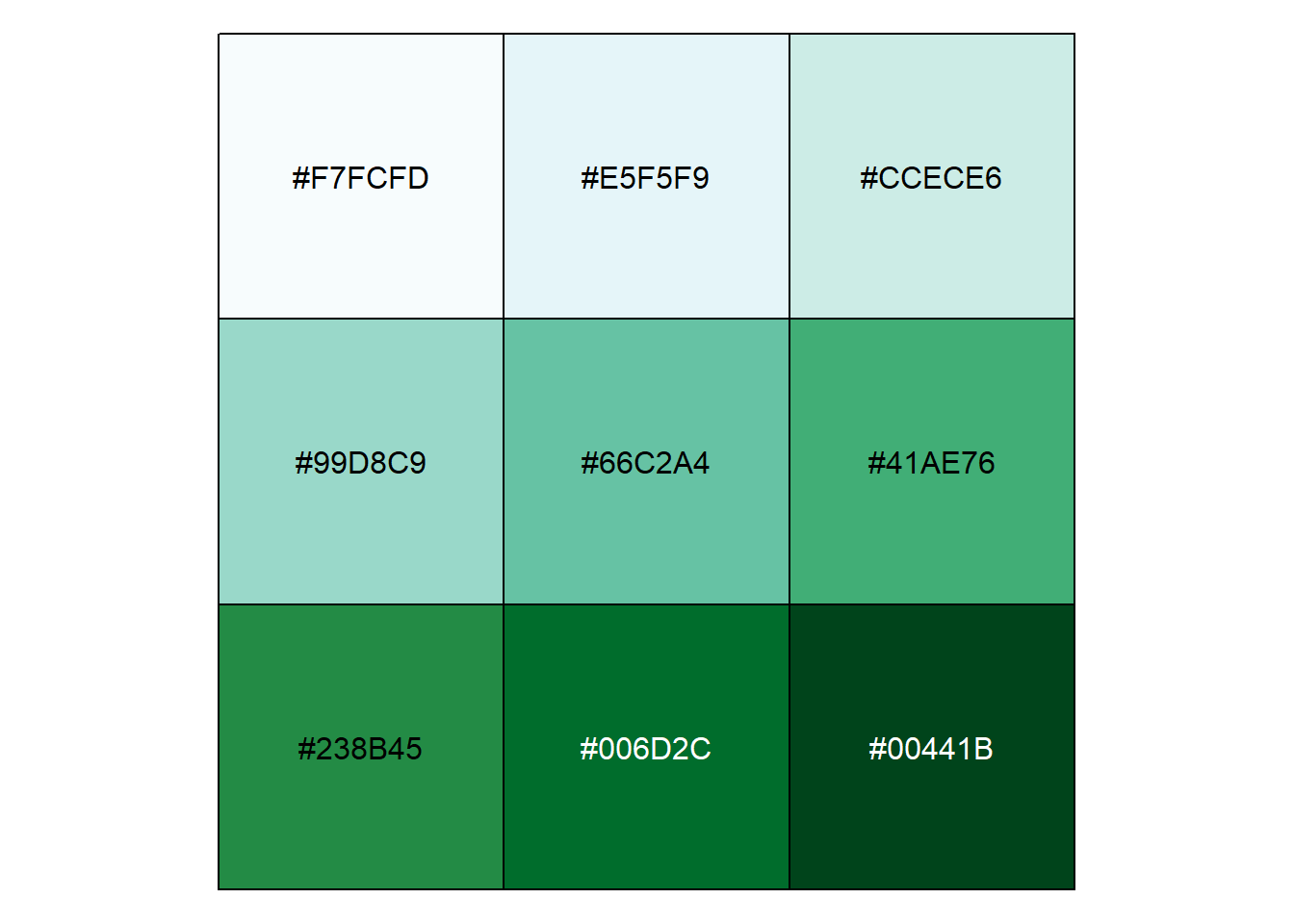 tempColors <- brewer.pal(9, "BuGn") # 获取配色方案的十六进制代码