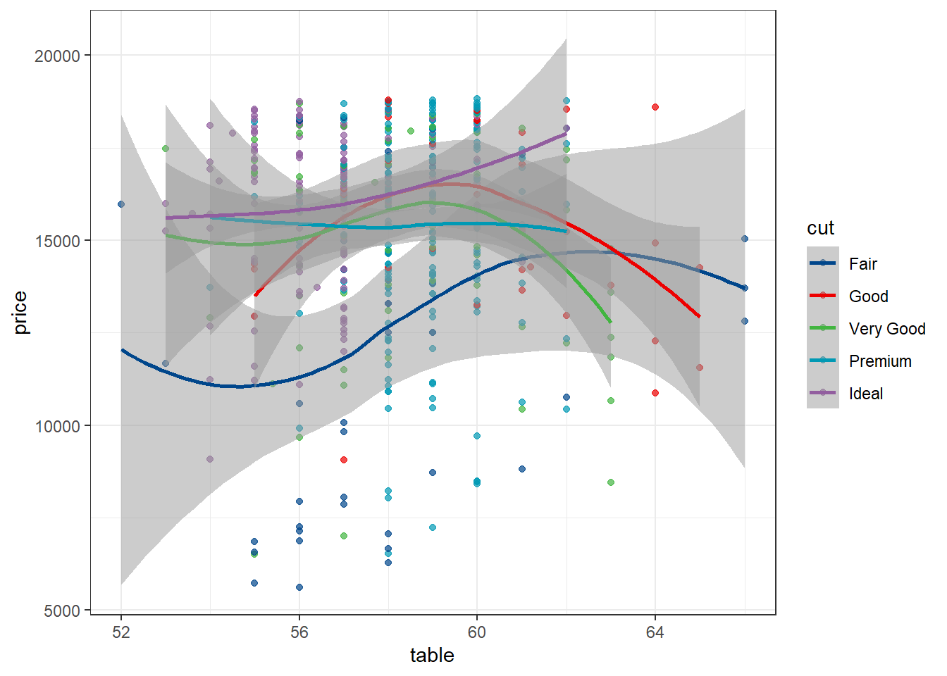 ggplot(aes(x = table, y = price, color = cut)) +